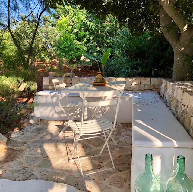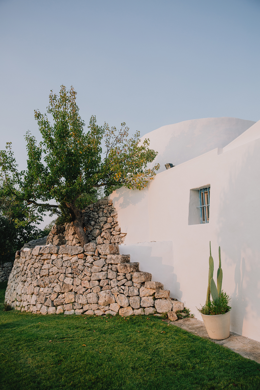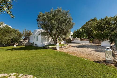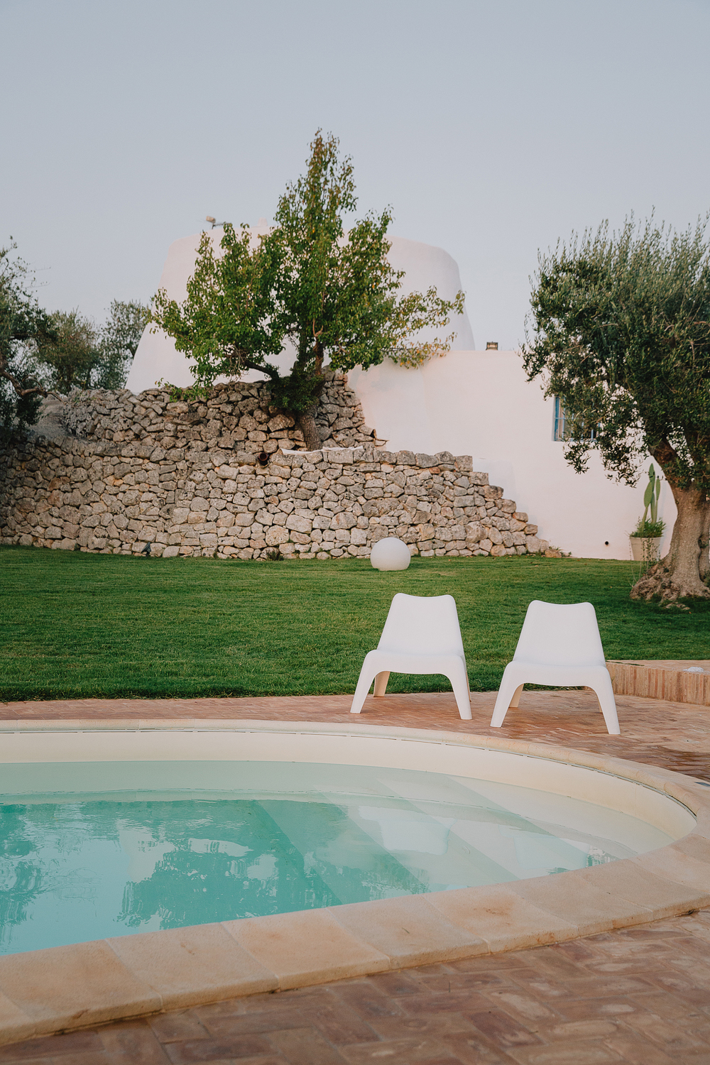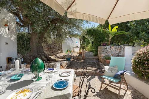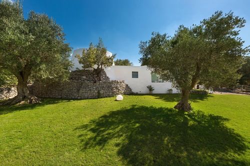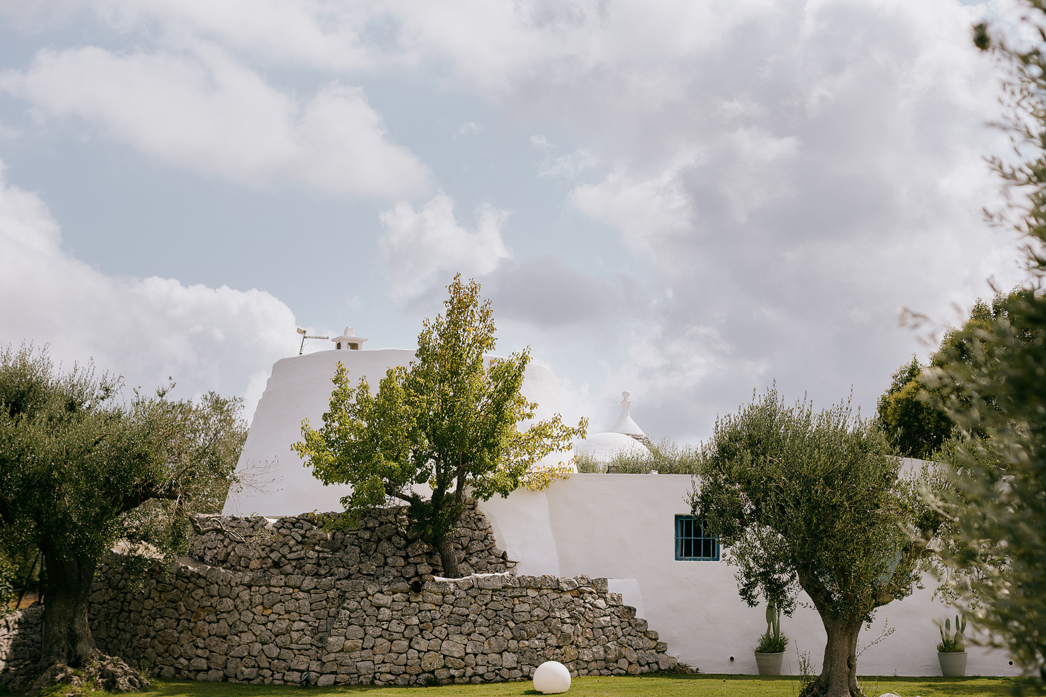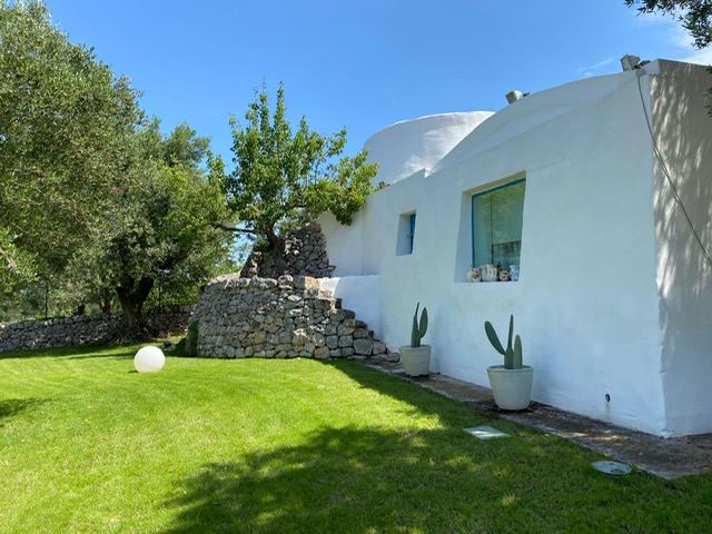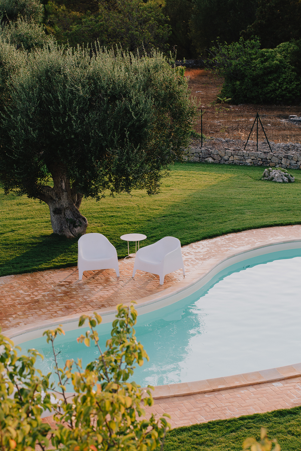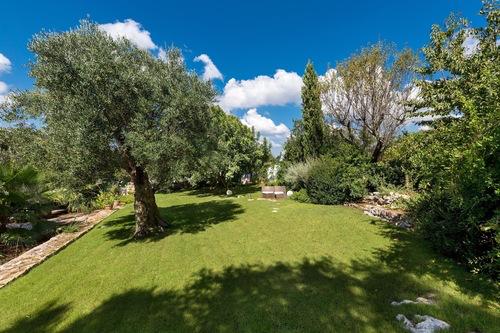 A far da cornice a Il sogno di Nora vi sono le verdi e rigogliose chiome degli ulivi della Valle d`Itria e un prato inglese ampio e curato.